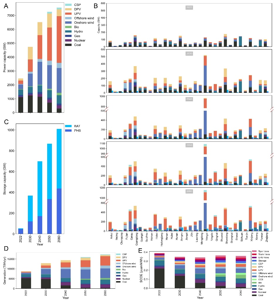图1.面向2060年的我国电力系统优化结果。(A)全国发电装机容量;(B)分省发电和储能装机容量;(C)全国储能装机容量;(D)全国发电结构;(E)全国电力系统平均度电成本结构(配电网成本除外)