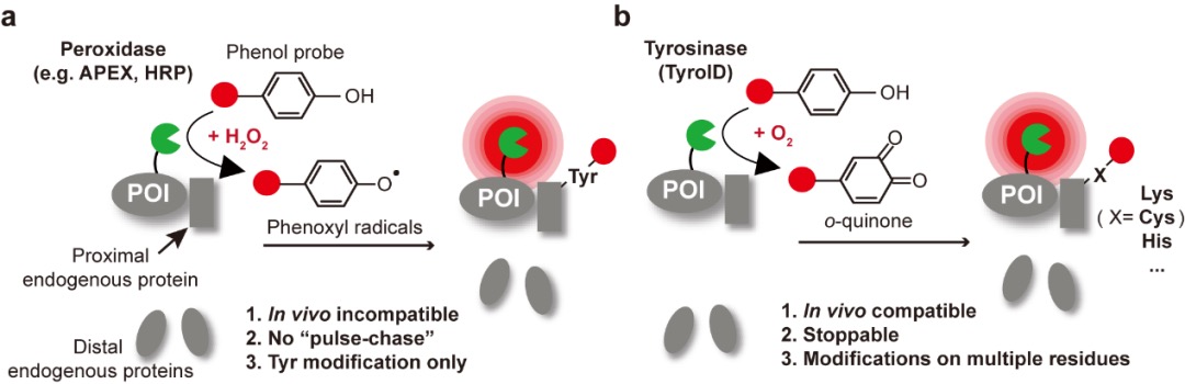 图1.(a)过氧化物酶(如 APEX 和 HRP)标记示意图;(b)TyroID标记示意图