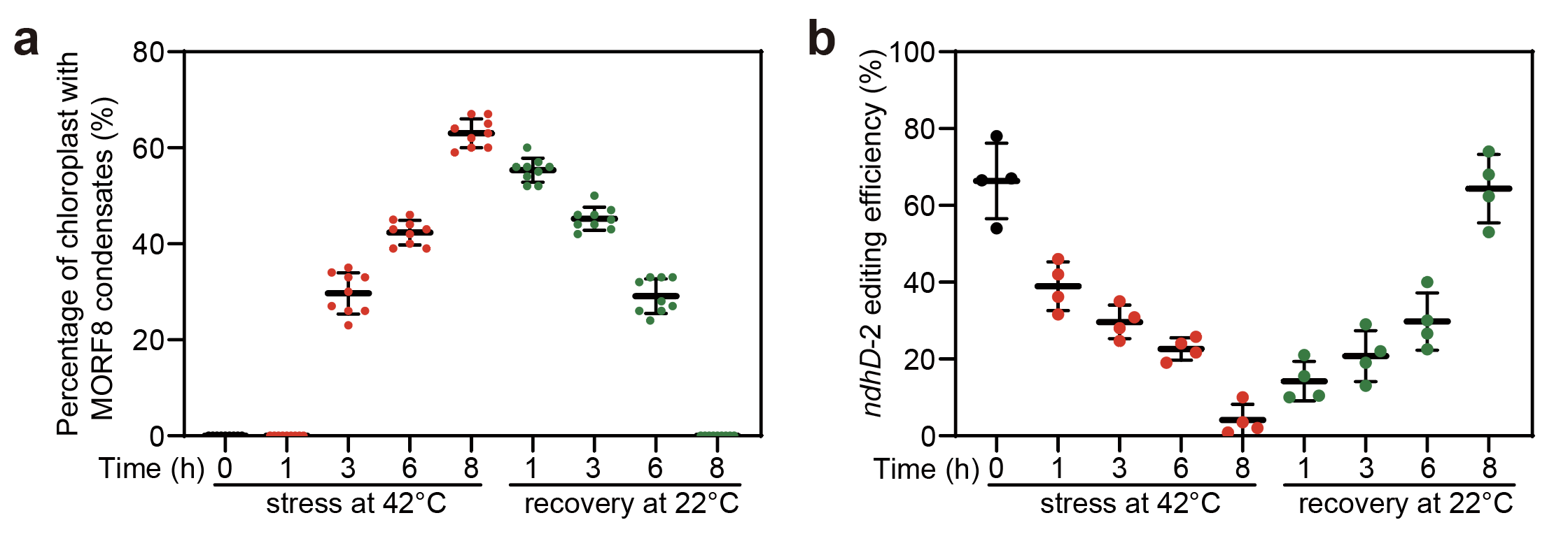 进一步研究发现,拟南芥在热处理与恢复过程中,叶绿体MORF8凝聚体的数量与ndhD-2位点的编辑效率呈明显的负相关关系。研究人员通过对一系列体内实验和光合作用相关参数的比较分析,建立了MORF8蛋白的相变与光合作用调控机制的耦合关系(图3)。