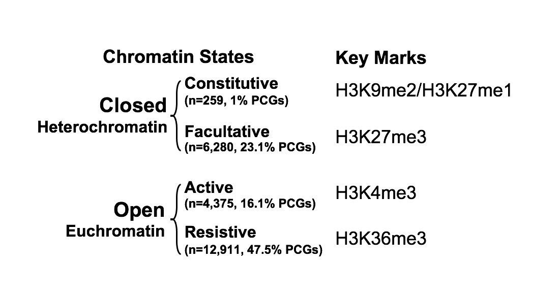 图3.染色质状态的四种主要分类及其代表性的组蛋白修饰标记