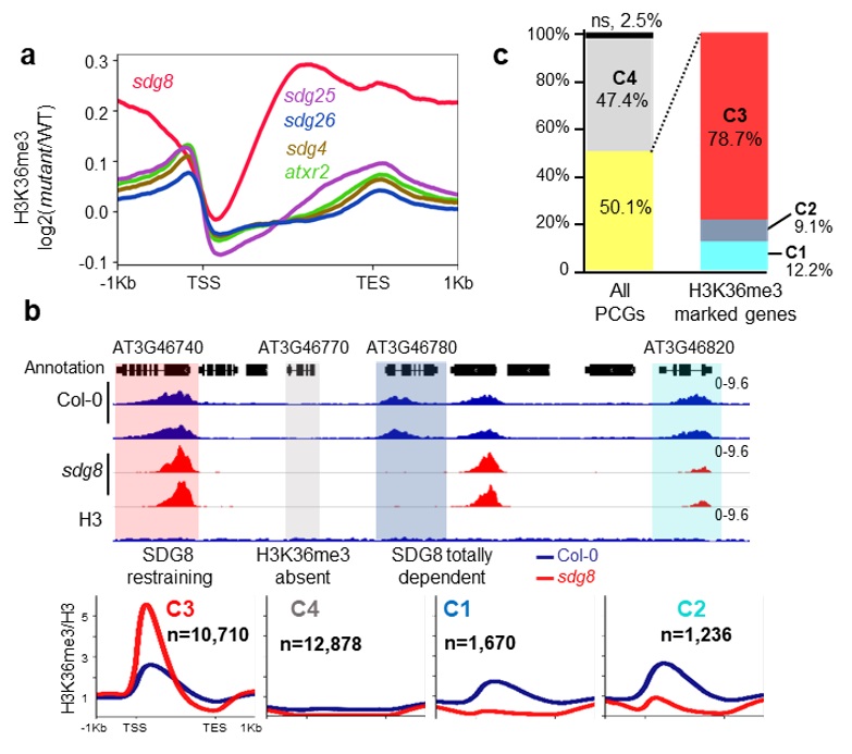 图1.SDG8基因突变导致C3类基因位点H3K36me3水平升高