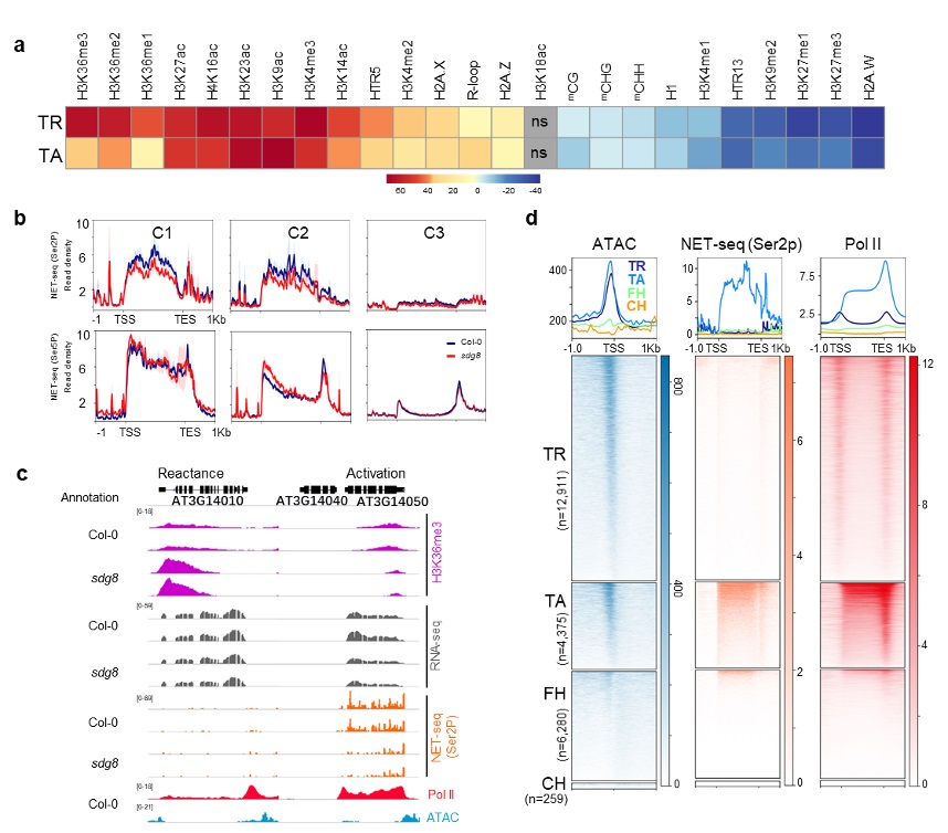 为了探究sdg8突变体中H3K36me3水平升高基因(C3基因)的转录状态,研究人员进行了新生转录本测序(NET-seq)。结果表明,无论在野生型还是sdg8突变体中,C3基因位点处几乎检测不到转录活性(图2b-d),这一结果与现有的H3K36me3增强转录延伸观点相悖。已知转录激活(Transcription Active,TA)区域为具有Pol II结合以及开放染色质状态(高信号的ATAC-seq)且转录水平较高的区域(图2a-d,图3)。与之相对应,研究人员将有Pol II结合(Pol IIChIP-seq)和开放染色质状态(ATAC-seq)但Pol II转录信号极低(Pol IISer2P NET-seq水平)的区域定义为“转录阻抗”(Transcription Resistive,TR)基因(图2a-d,图3)。