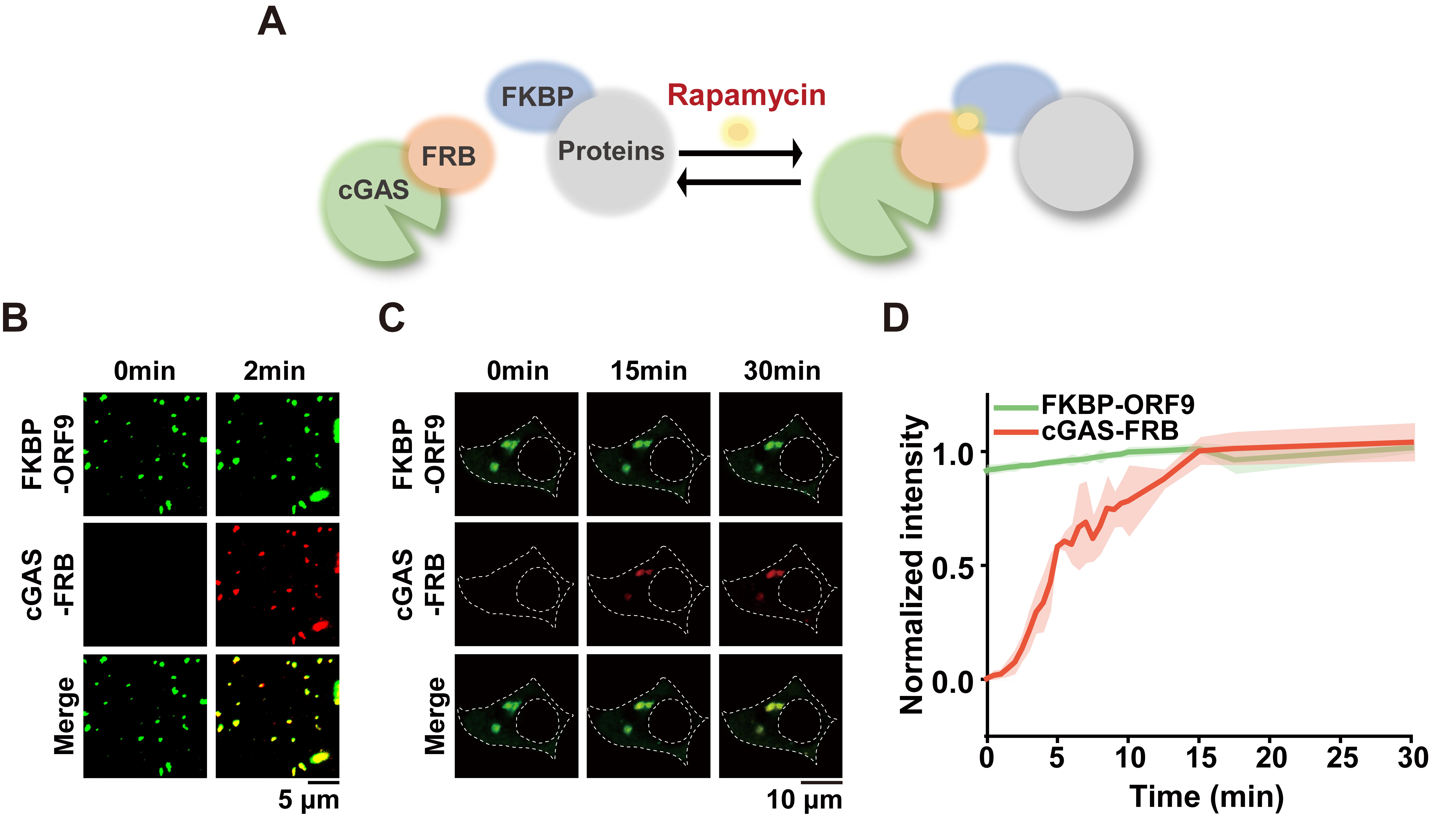 基于研究揭示的分子相互作用逻辑,研究人员提出通过可控调节蛋白与cGAS的相互作用力的强弱实现对cGAS相分离和激活的调节。化学小分子雷帕霉素可以诱导蛋白结构域FKBP与FRB的相互作用。基于这一化学诱导手段,利用雷帕霉素调控FKBP-抑制蛋白与cGAS-FRB的亲和力,使cGAS在2分钟内重新形成液滴状结构。同时,该诱导系统成功在5至15分钟内迅速在活细胞内诱导cGAS相分离,并显著增强其活性。
