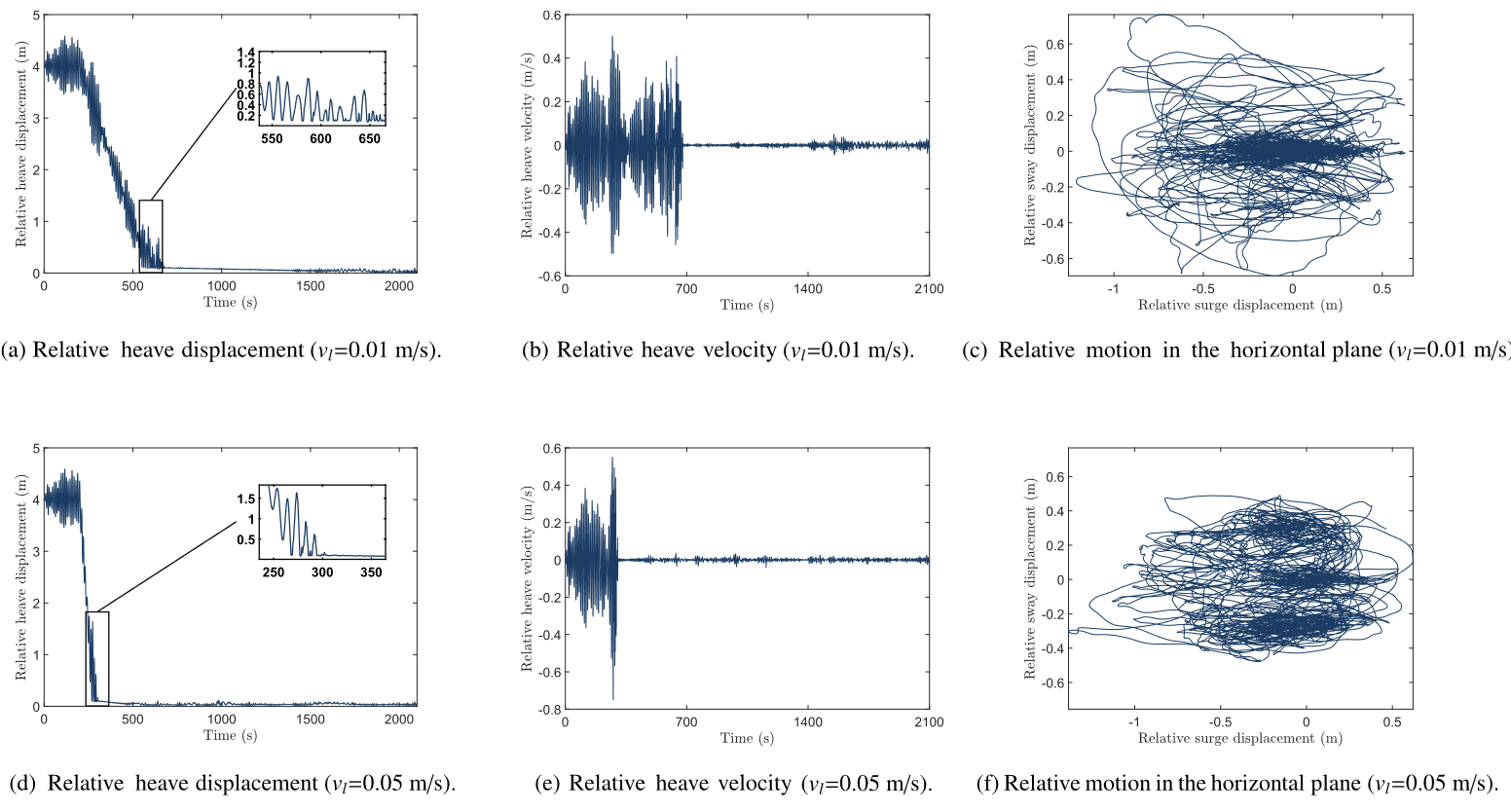 针对上述一系列问题,8xbet.com深圳国际研究生院任政儒团队围绕漂浮式风电一体化运输安装技术,对于装配下放过程的动力学进行了分析,建立“浮船-吊机-风机-浮式基础”多体耦合的高保真动力模型,并探究整个系统在不同海况及下放作业设置中的影响。研究揭示了在海洋荷载影响下进行装配下放作业过程中,浮式基础及风机在接触的一瞬间受到较大的冲击荷载作用,并且伴随缆绳张力突变,冲击荷载及缆绳张力幅值由相对速度决定。
