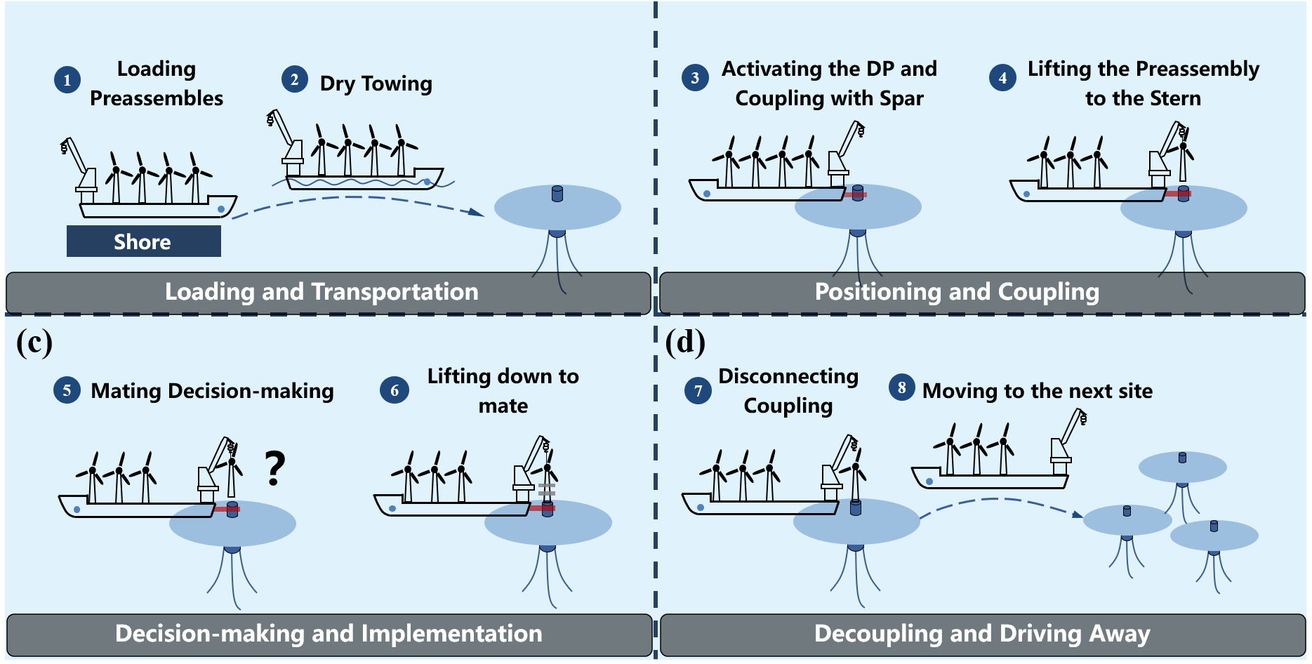 然而,在结构自身水动力差异影响及复杂的海洋荷载作用下,安装船与浮式基础形成周期性相对垂荡,安装船的纵向摇晃更加剧处在船首的风机上部预装配件同浮式基础间的相对运动,造成装配过程中潜在的作业风险。同时,海上吊装作业作为海上作业常用的技术手段,现有研究缺乏面向“浮船-吊机-风机-浮式基础”这类复杂多体系统的相关研究工作,风浪流多场耦合动力环境更是加剧了系统研究复杂程度。