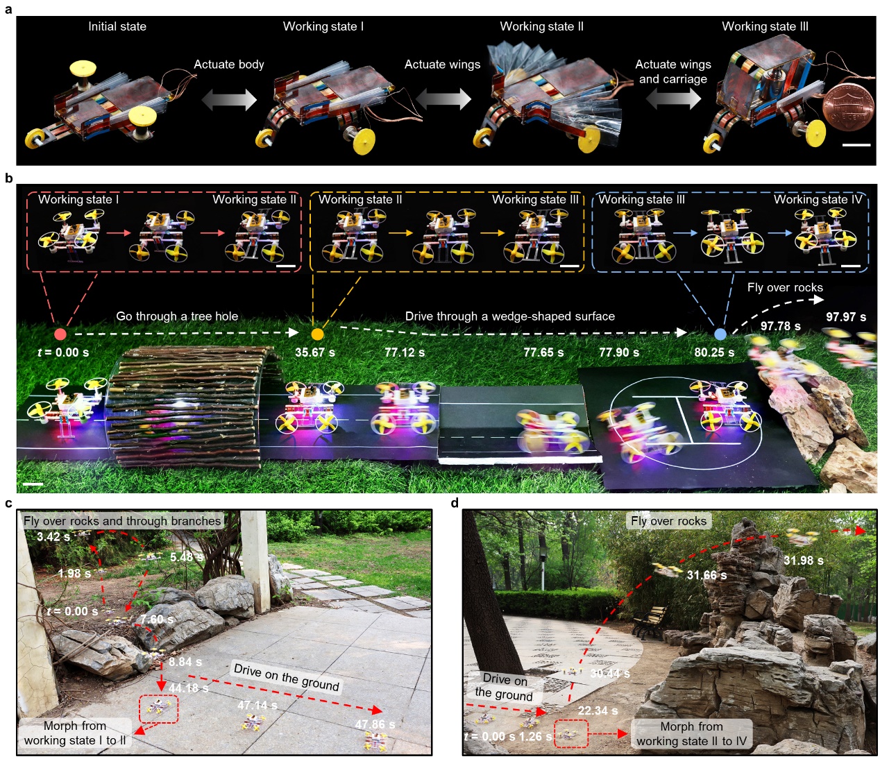 图2.基于该驱动器的可重构系统。(a)为多功能微型轮式机器人;(b)为微型陆空两栖机器人;(c)-(d)为微型陆空两栖机器人的户外运动场景展示。(比例尺:(a)10mm、(b)30mm)
