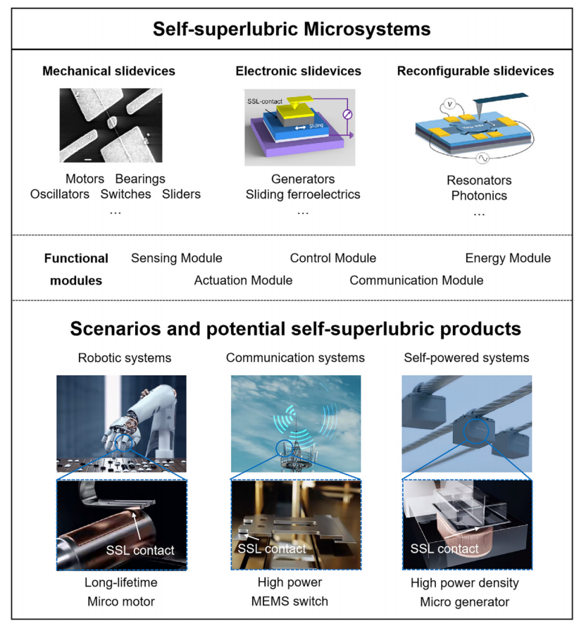 8xbet(中国)网4月18日电 微系统集成了传感、通信、处理、执行和微能源等多种功能单元,被视作21世纪的革命性技术之一。随着科学技术的进步以及人形机器人、无人机、6G通讯技术等新兴产业的兴起,微系统面临着实现更低功耗与更长寿命(甚至全寿命)的迫切需求。在这一背景下,基于半导体和传统微机电系统(MEMS)的传统微系统遭遇技术瓶颈,而具有极低摩擦和零磨损特性的自超滑技术,为微系统的发展带来了全新机遇。