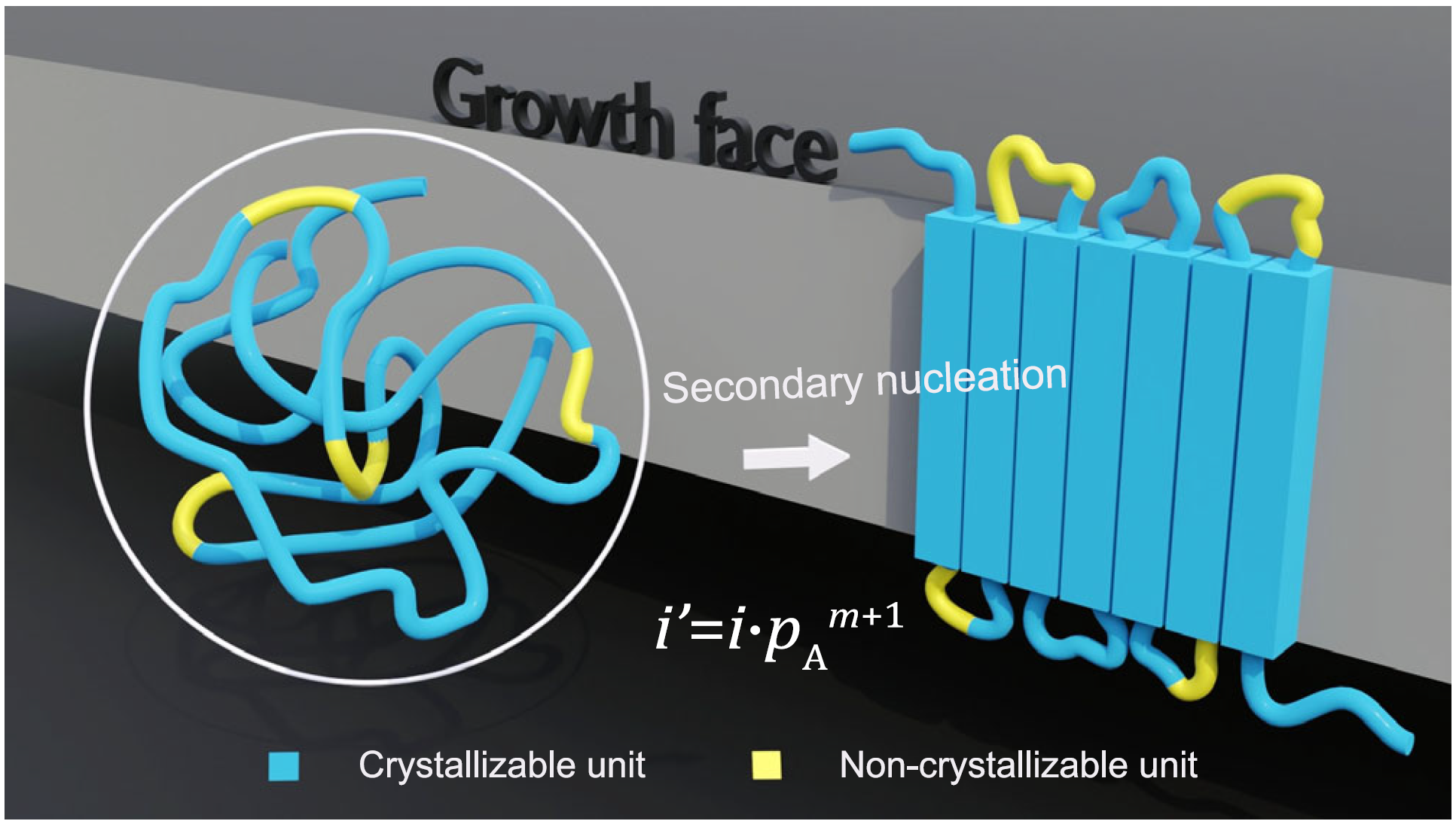 近日,8xbet.com化工系徐军课题组基于无规共聚物结晶成核过程中对分子链上可结晶单元随机选择的概率模型(图1),建立了基于成核动力学测定临界晶核尺寸的理论方法,成功测定了稀溶液中聚丁二酸丁二酯单晶生长晶面上的次级临界晶核尺寸。