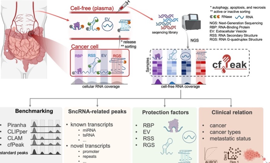鲁志团队多年来一直专注于cfRNA相关的技术开发和临床应用研究,在这项最新发表的工作中,研究人员通过统计建模与机器学习方法开发了一个新型的生物信息学方法cfPeak,该方法在真实和模拟数据集中均表现出比其他峰值鉴定方法更敏锐的片段化峰区识别能力。该研究为cfRNA片段组学的系统分析提供了可行方案,揭示了cfRNA保护性片段在生物学及临床应用中的重要意义。同时,该研究还强调了低丰度、潜在组织来源cfRNA信号在液体活检中的临床应用价值。