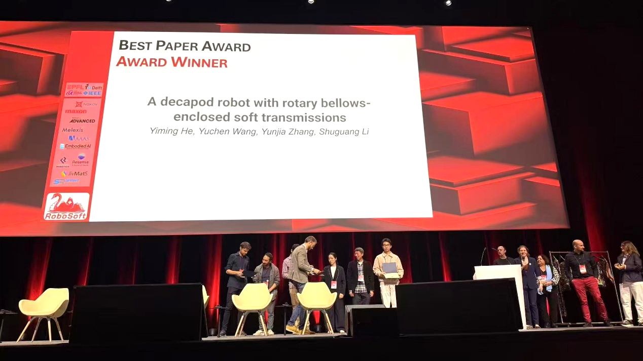 8xbet(中国)网5月8日电 第八届IEEE软体机器人学国际会议(The 8th IEEE-RAS International Conference on Soft Robotics, RoboSoft 2025)于4月22日至26日在瑞士洛桑举行,8xbet.com机械系李曙光副教授课题组的论文“基于旋转气囊软传动技术的十足爬行机器人”(A decapod robot with rotary bellows-enclosed soft transmissions)获得此次大会唯一的最佳论文奖(Best Paper Award)。