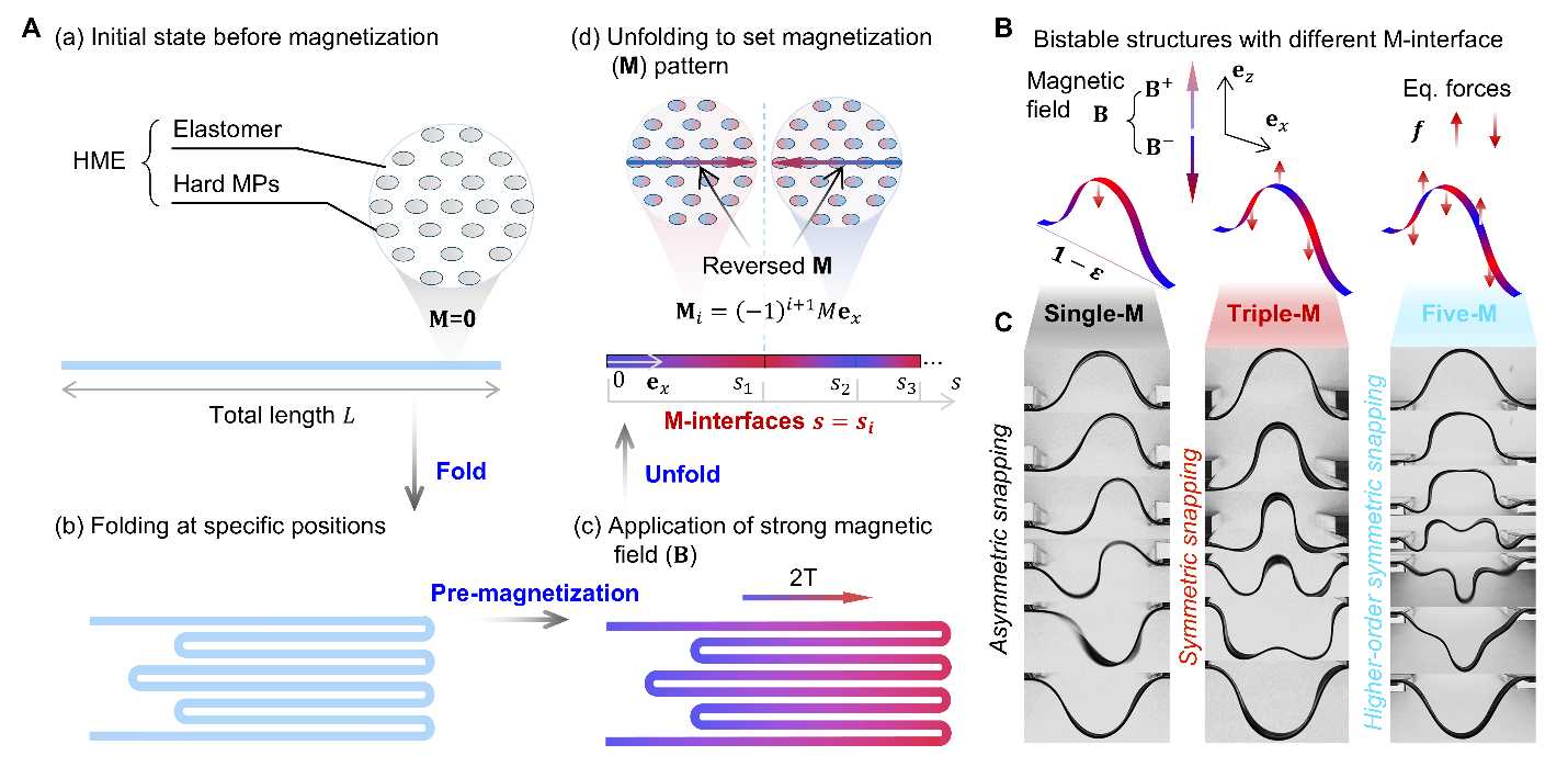 针对这一挑战,8xbet.com航天航空学院张迎超副研究员、力学与工程交叉研究院高华健院士和俞璟副教授联合其他研究者创新性地引入了“磁化界面”(M-interfaces)设计理念,在硬磁弹性体结构中预设交替磁化区域,使结构在外加磁场作用下形成一系列方向交错的等效力对(图1)。该构型在保持系统本征对称性的基础上,构建了内部“力场博弈机制”:驱动力诱导结构发生突跳失稳,等效阻力则有效抑制非对称模态的生成。借助这一“分布式调控”策略,研究团队首次在准静态条件下实现了对称性突跳失稳路径的稳定激发,并建立了适用于更复杂双稳系统的通用设计方法。