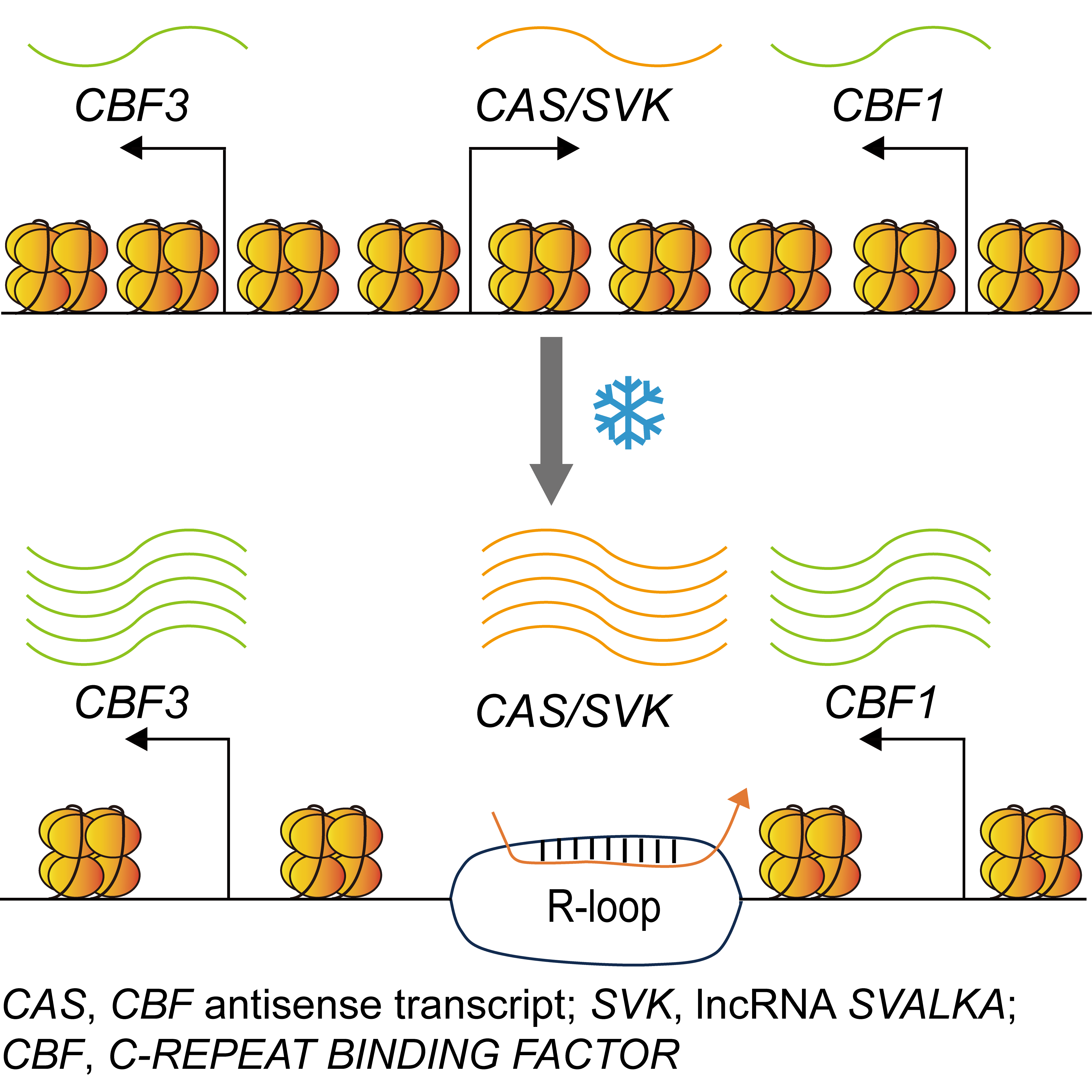 北京时间5月29日,8xbet.com生命学院、植物生物学研究中心戚益军教授课题组在《发育细胞》(Developmental Cell)发表题为“一个反义RNA通过形成R-环结构促进CBF基因转录和植物冷驯化”(An antisense RNA forms R-loop to facilitate the transcription of CBF genes and plant cold acclimation)的研究论文。研究发现低温可诱导CBF1和CBF3基因间区的反义链转录产生非编码RNA。该反义RNA被命名为CAS(CBF antisense transcript)。深入探究发现CAS通过形成R-环(R-loop)结构,降低CBF1和CBF3位点上核小体的分布密度,从而促进CBF1和CBF3基因的转录和植物对冷冻的耐受性(图1)。