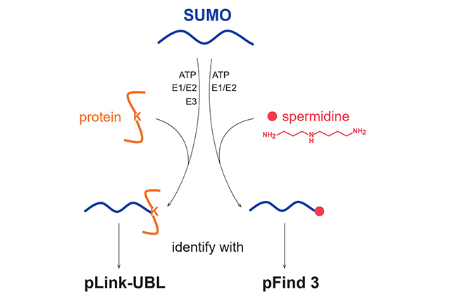 研究团队利用单肽搜索引擎pFind3能够寻找未知修饰的特长(blindsearch mode),结合抗体富集SUMO蛋白C-端多肽,开发了鉴定SUMO小分子底物的质谱方法,并在裂殖酵母中发现多胺类分子亚精胺(spermidine)是主要的SUMO小分子底物。团队在小鼠和人源质谱数据中也发现了SUMO-亚精胺共价连接体的存在。这是多胺类分子首次作为SUMO小分子底物被报道。