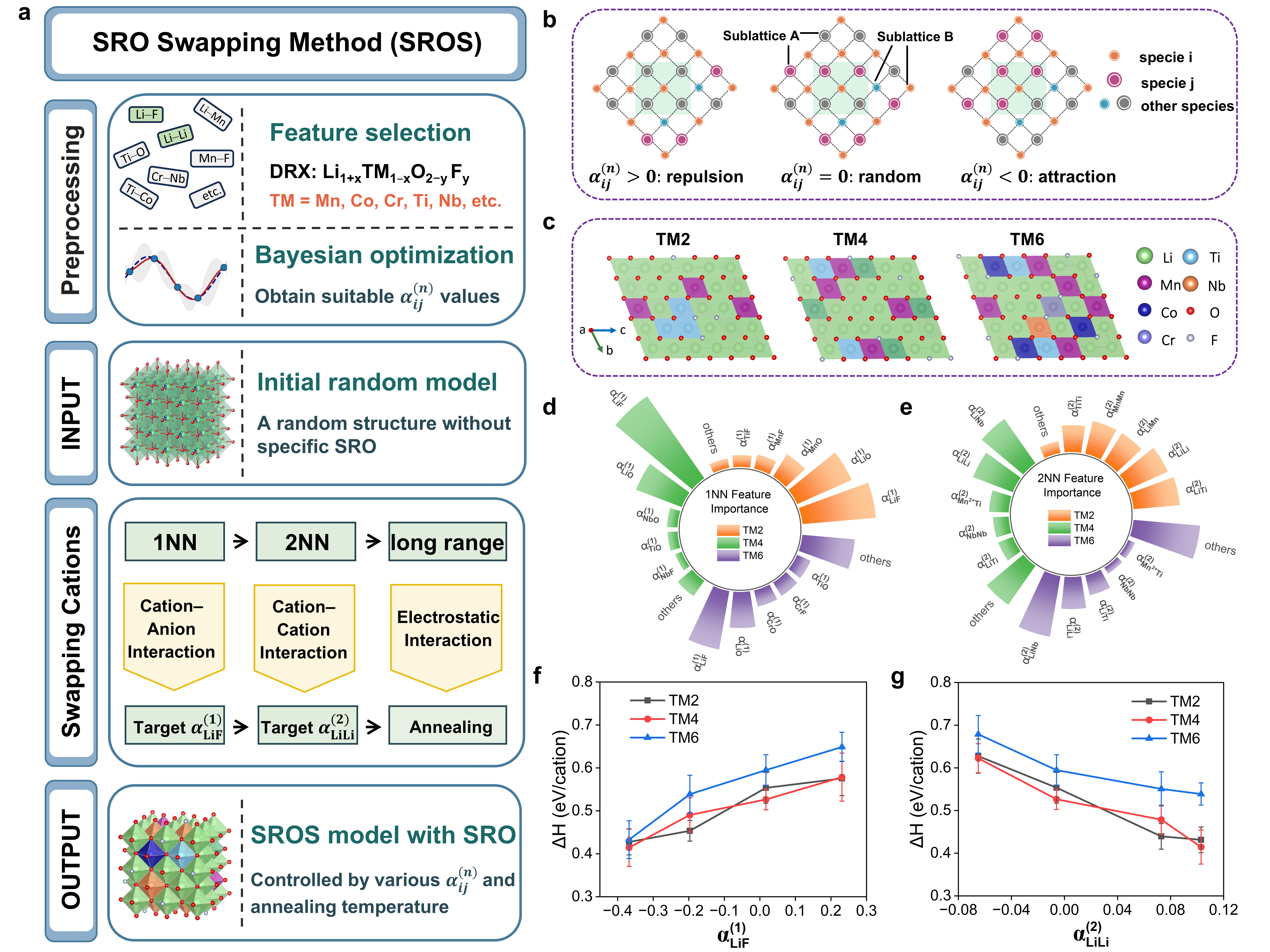 理解无序岩盐型高熵材料(HE-DRX)中的SRO现象对材料成分与结构设计至关重要。研究团队与中国科学院大学副教授伦正言合作,创新性地提出了基于关键描述符的SROS算法(Short-Range Order Swapping, SROS),为高熵无机非金属材料SRO结构模拟难题提供了一种高效精准的解决思路。
