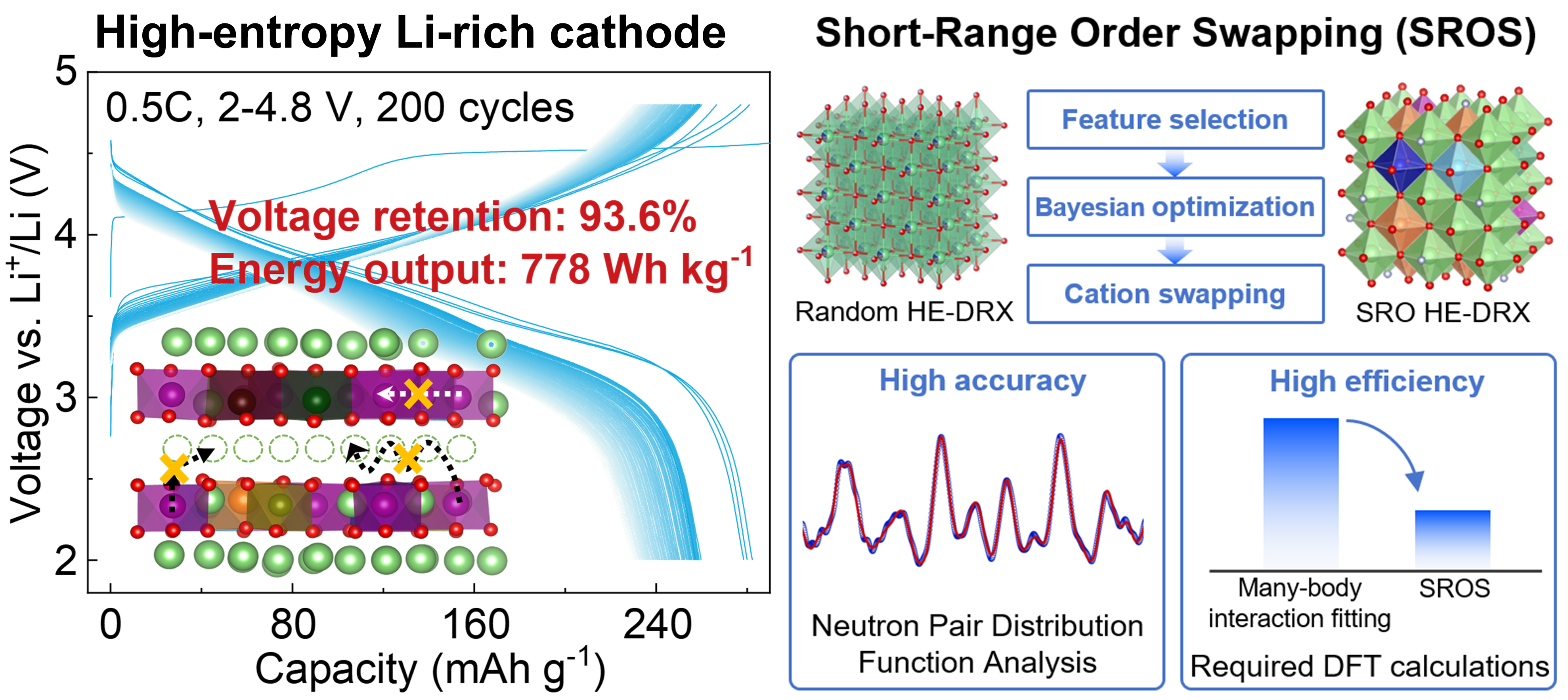 8xbet(中国)网6月9日电 高熵概念的兴起为突破锂离子电池正极材料循环寿命和能量密度的性能瓶颈提供了全新机遇,由于其化学组分的复杂性,现有研究仍面临两大挑战:一是高熵效应从动力学角度调控电化学行为的物理机制尚未明确,二是难以高效准确地建立含短程有序(SRO)结构的原子尺度机理模型。