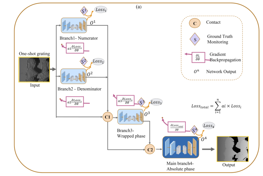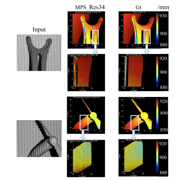 同时,尽管基于深度学习的SL3D技术近几年来飞速发展,通过单帧输入端到端预测的方式获得高精度的3D点云仍然是一个尚未解决的挑战。团队提出了多路物理监督辅助的单帧端到端绝对相位预测网络(Multi-path branch auxiliary supervision network, MPS_XNet)。具体来说,MPS_XNet基于绝对相位时间展开物理模型的三个关键阶段,分子、分母和包裹相位,作为辅助分支来帮助绝对相位主路进行长距离非线性预测。此外,基于此模型设计了专属多路损失函数,促使网络沿着模型定义的方向学习最优路径。MPS_XNet不仅弥补了单帧输入信息的不足,而且通过将单个长距离预测难题转换为多个短距离子任务,以可解释的方式指导网络训练,大幅提升了网络预测精度。