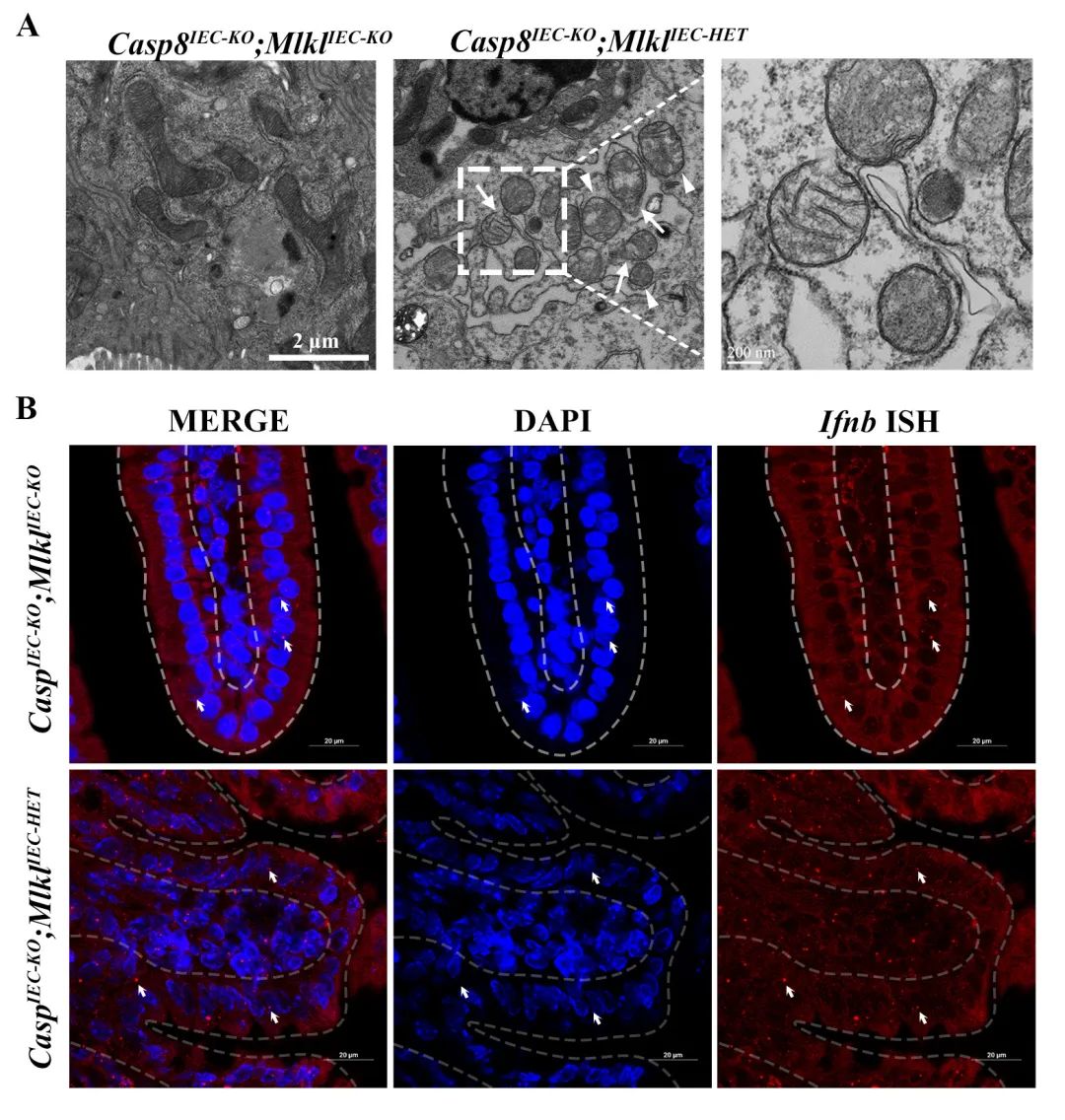 部分极早发性炎症性肠病(IBD)患者因Caspase8蛋白表达降低而导致肠上皮细胞发生程序性坏死。研究人员构建了肠上皮特异性诱导敲除Caspase8的小鼠模型。注射他莫昔芬诱导后,小鼠出现肠炎症状,包括肠上皮损伤、中性粒细胞浸润和肠上皮杯状细胞减少等。在肠上皮细胞中同时敲除RIPK3或MLKL,可完全抑制由程序性坏死引发的肠炎症状。透射电镜在肠上皮细胞中观察到破损的线粒体,分离的肠上皮细胞胞质中游离mtDNA也显著增加。荧光原位杂交显示IBD小鼠肠上皮中Ifnb表达显著升高,干扰素刺激基因产物IFI44蛋白水平也增加。注射STING抑制剂H-151可降低肠上皮细胞中Ifnb表达和IFI44蛋白水平,减少中性粒细胞浸润,并加速炎症消退。