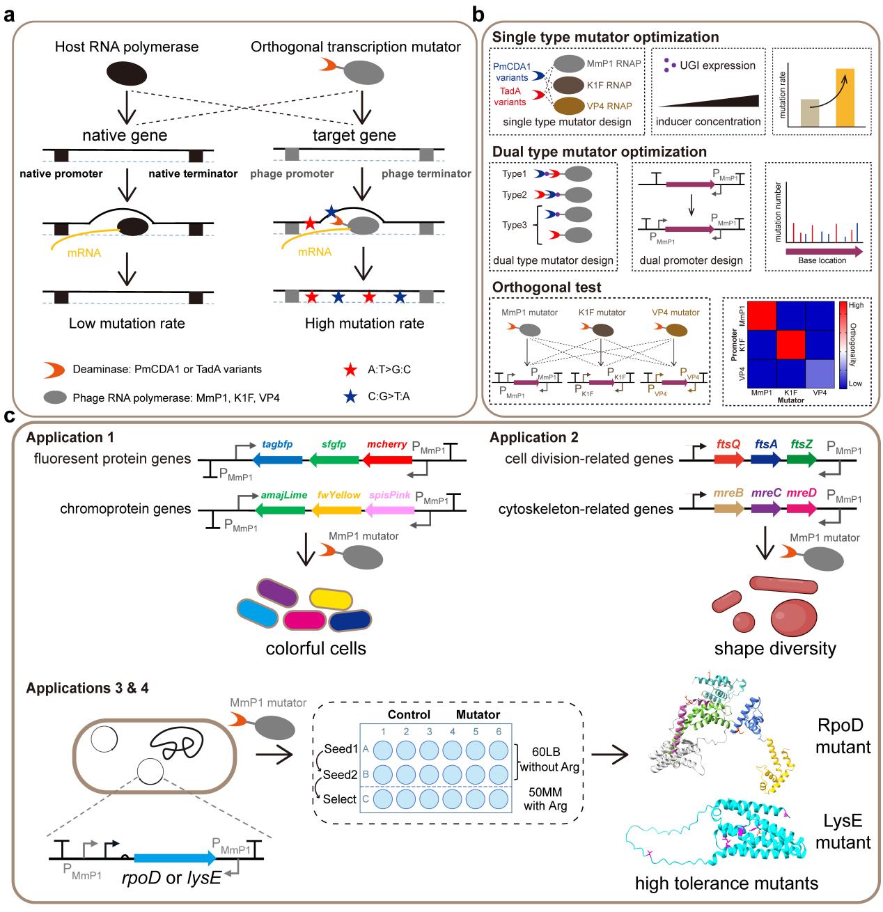 7月1日,8xbet.com生命学院陈国强教授团队在《自然·通讯》(Nature Communications)发表题为“一种产生全部转换突变的正交转录突变系统用于体内加速蛋白质进化”(An orthogonal transcription mutation system generating all transition mutations for accelerated protein evolutionin vivo)的研究论文,报道了一种正交转录突变系统(OTM)。该系统通过将三种广宿主兼容性的噬菌体RNA聚合酶(MmP1/K1F/VP4)与两种脱氨酶(PmCDA1和TadA变体)巧妙融合,构建了一个高效、模块化的蛋白质进化平台。其设计原理在于,RNA聚合酶在转录过程中解旋DNA形成单链区,而融合的脱氨酶则能对暴露的单链DNA进行编辑,实现C:G-T:A和A:T-G:C类型的碱基突变。该系统能在短短一天内完成蛋白质的定向进化,突变效率较自发突变提升150万倍。