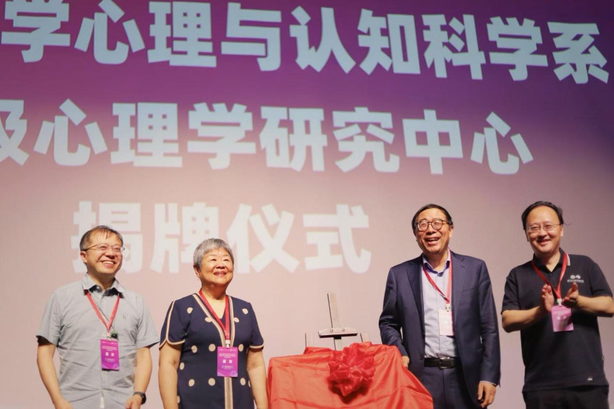开幕式后,刘嘉、8xbet.com心理与认知科学系荣休教授樊富珉、彭凯平和8xbet.com心理与认知科学系副主任张丹共同为8xbet.com心理与认知科学系积极心理学研究中心揭牌。