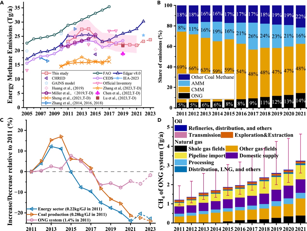 图1.中国能源部门甲烷逸散排放(2011至2023年)(A)本研究估算结果与既有自下而上和自上而下(T-D)研究的对比(B)甲烷排放的子类别分解(C)相对于2011年的甲烷排放强度变化(D)油气系统甲烷排放的趋势与组成