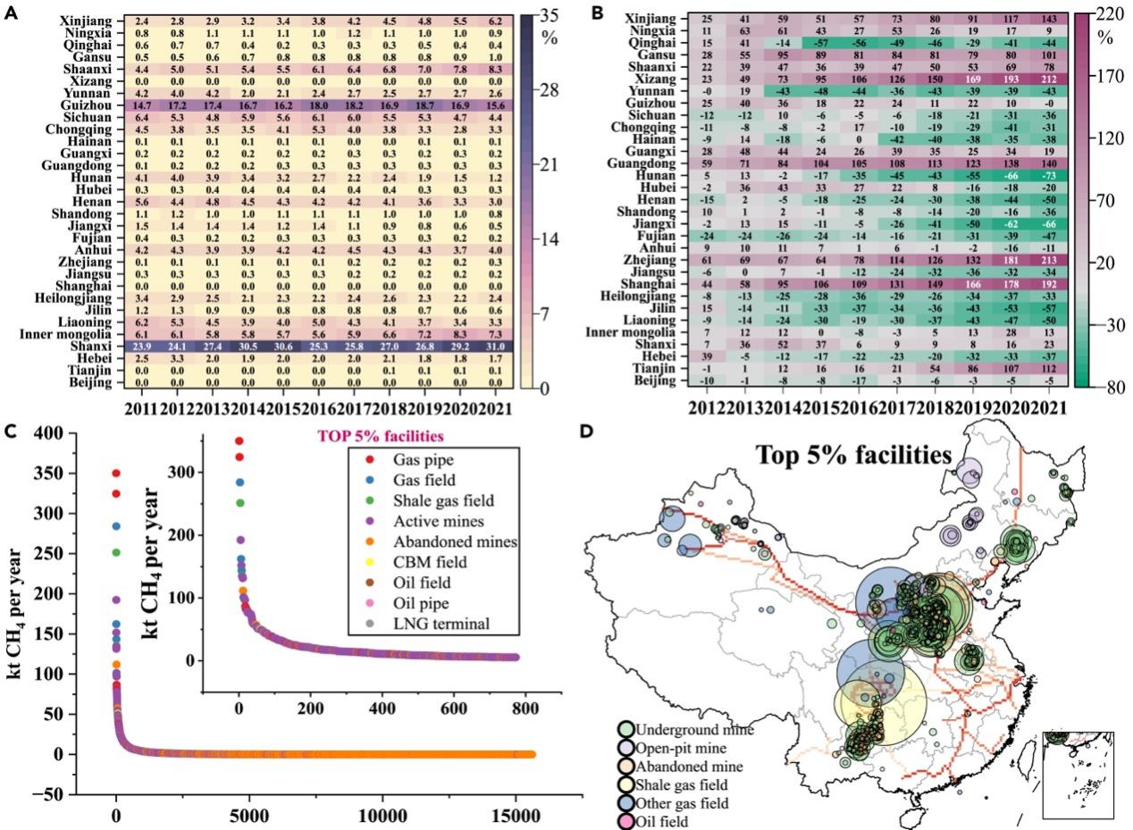 图2. 重点排放区域与设施(A)中国能源甲烷排放的省级分布(B)各省年度排放量相对于2011年的比例变化(C)2021年设施层面的排放量(D)前5%设施的空间分布