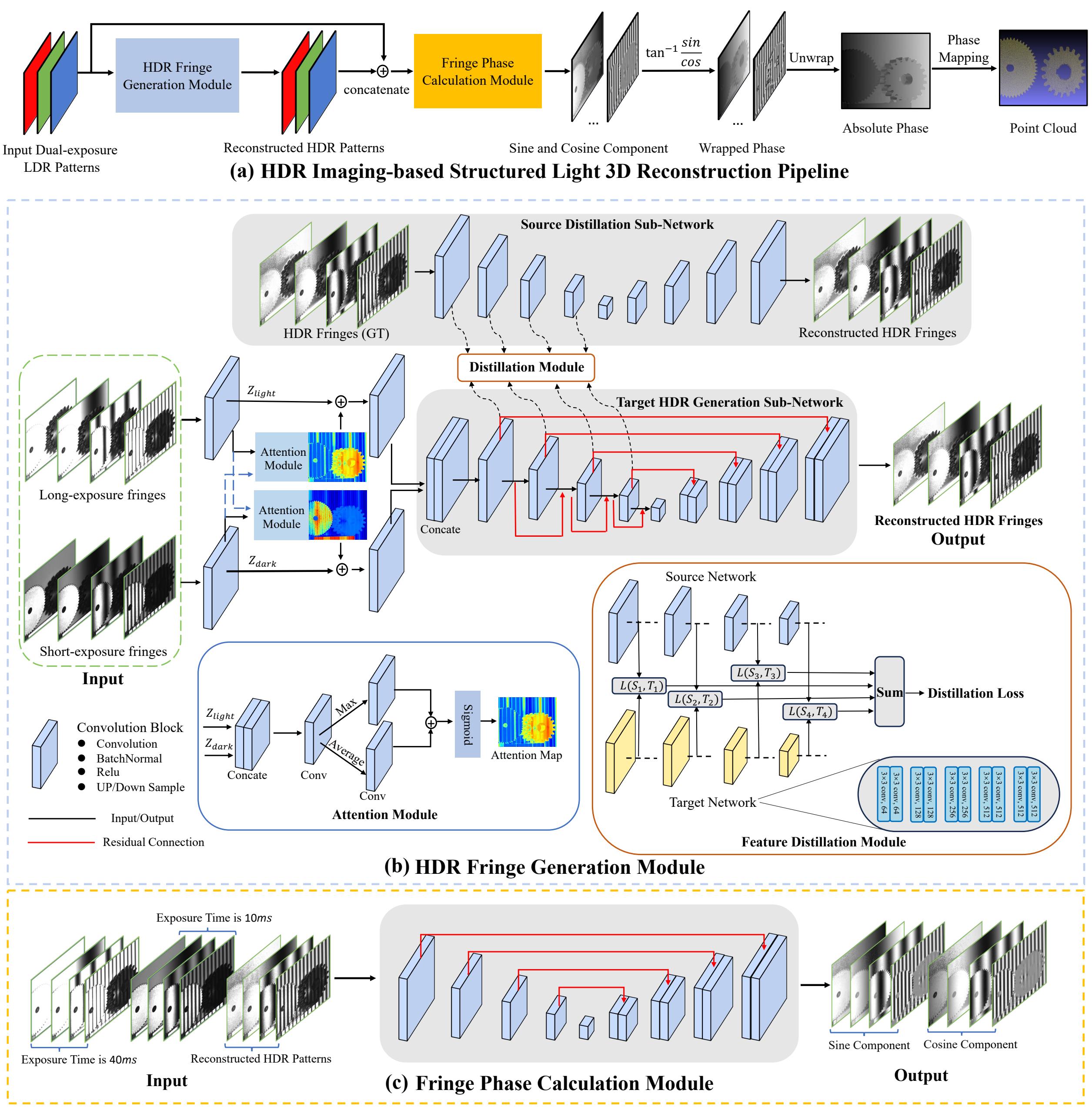 近日,8xbet.com深圳国际研究生院李星辉副教授团队与鹏城实验室合作提出了一种基于深度学习的HDR结构光三维重建网络——高动态范围结构光网络(HDRSL-Net)。该网络包含HDR条纹生成模块和相位求解模块。HDR条纹生成模块通过长短曝光的低动态范围条纹图输入,利用注意力权重引导网络聚焦于高反射物体的低曝光条纹和低反射物体的高曝光条纹特征,同时通过特征层的权重蒸馏约束特征边界,从而合成具有相位特征的HDR条纹,显著减少所需曝光次数。相位求解模块则解算重建后的HDR条纹图案中的相位信息。最终,HDRSL-Net保留了传统多次曝光相移方法的高精度和抗干扰性,将所需条纹图案由传统的K×N×M减少至2×N×1,大幅提升了测量速度。