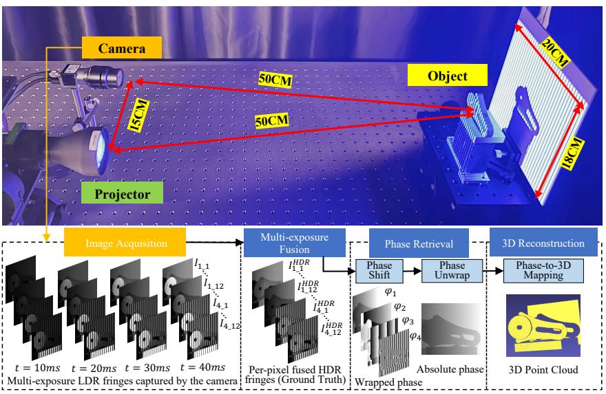 针对当前缺乏HDR场景结构光数据集的问题,研究团队基于工业应用场景,搭建了面向HDR场景的结构光测量系统,并整理了包含1700组金属物体的结构光数据集。该数据集涵盖不同反射率材料、机加工特征、形状和尺寸,每个物体采用4次曝光、4频、12步相移法处理,结果作为真值数据。该数据集可作为HDR场景测量的结构光基准数据集。