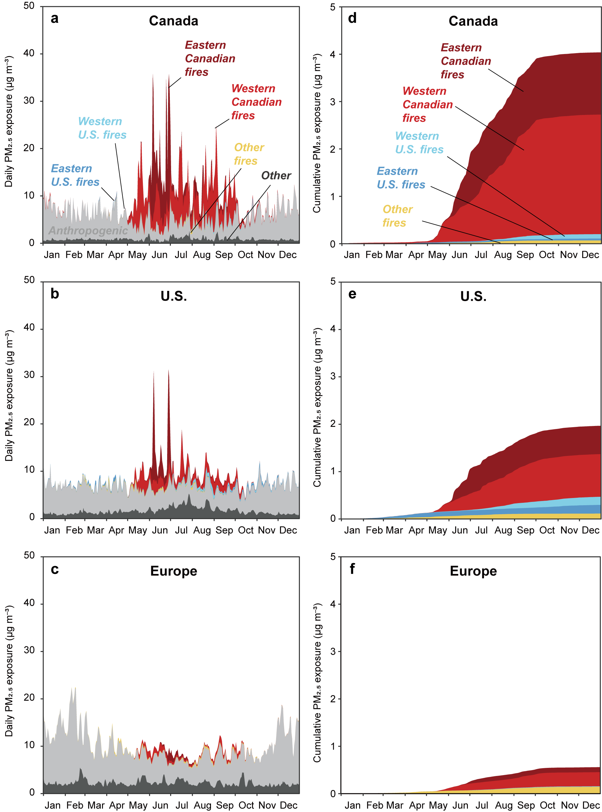 图3.2023年加拿大、美国和欧洲地区人群逐日PM2.5污染暴露水平及来源