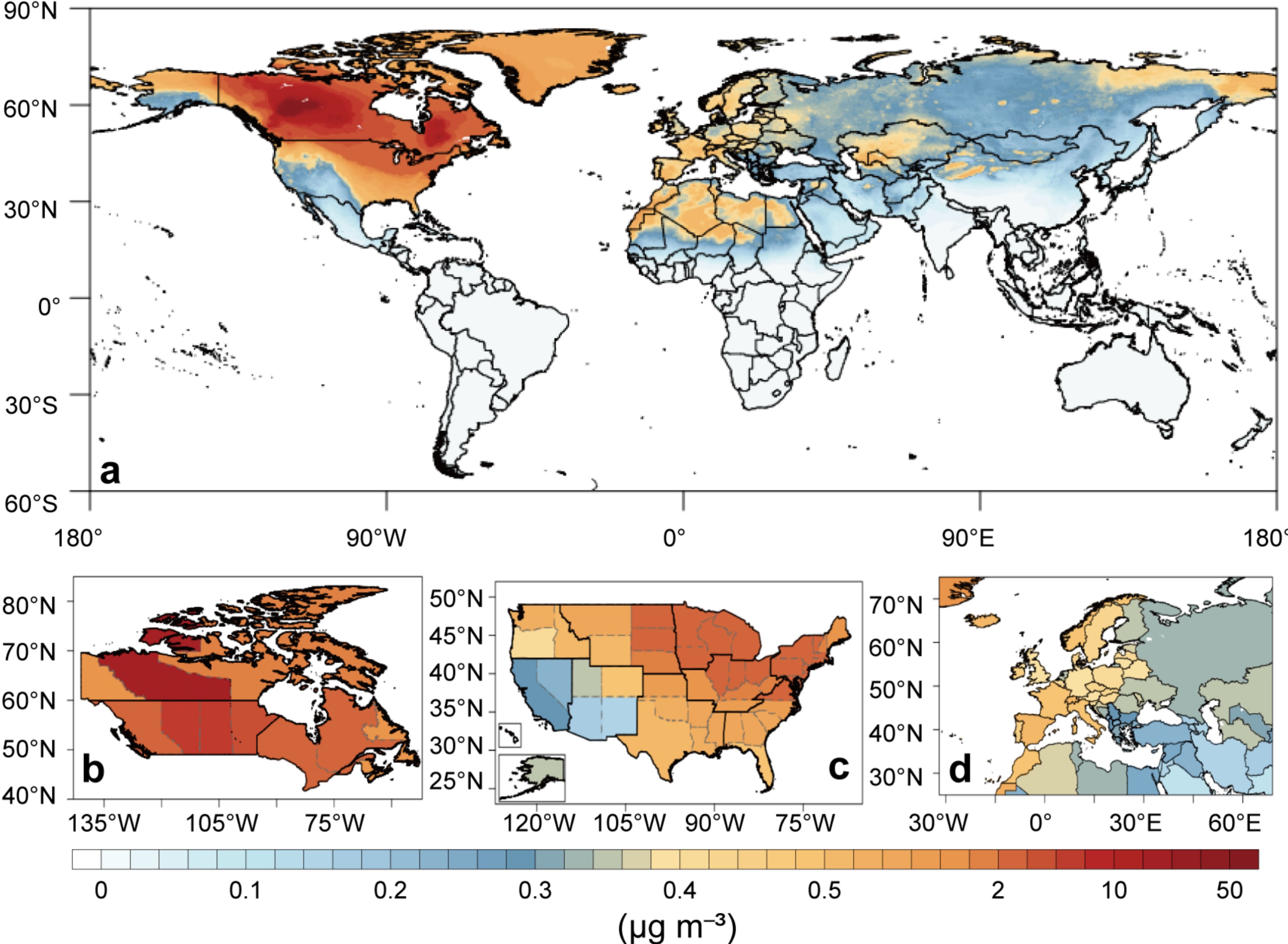 图2. 2023年加拿大极端野火导致的年均PM2.5污染暴露