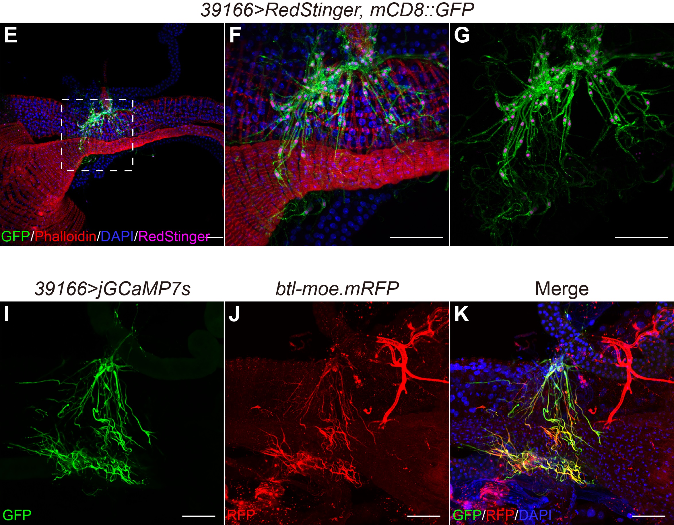 图3.39166-GAL4标记的气管细胞(btl标记)缠绕嗉囊导管末端和中肠前段