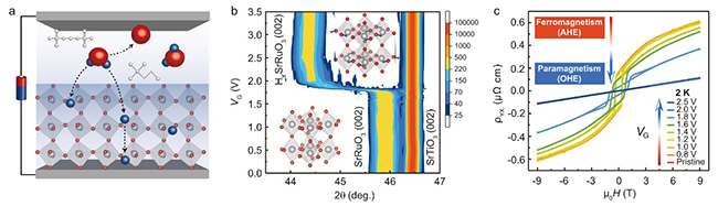 图:a.离子液体门电路调控实现SrRuO3的质子化过程;b.X射线衍射测量表明SrRuO3中随质子化进程产生的结构相变;c.不同门电压下霍尔电阻的变化表明材料经历铁磁到顺磁的磁转变。