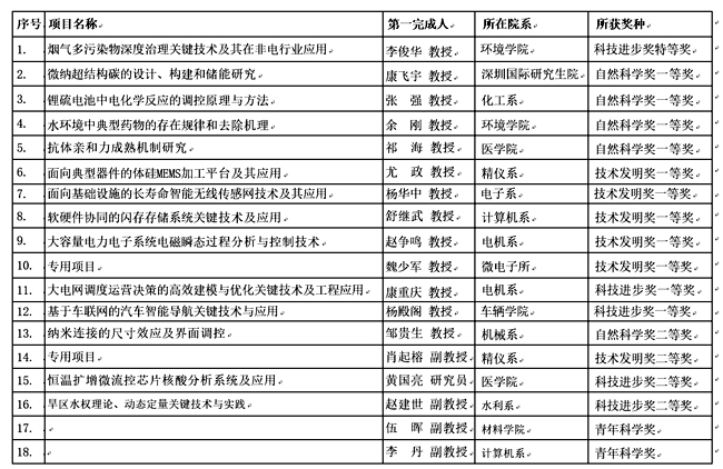 此外,还有深圳国际研究生院康飞宇教授、化工系张强教授、环境学院余刚教授、医学院祁海教授主持完成的项目获自然科学奖一等奖。精仪系尤政教授、电子系杨华中教授、计算机系舒继武教授、电机系赵争鸣教授、微电子所魏少军教授主持完成的项目获技术发明奖一等奖。电机系康重庆教授、车辆学院杨殿阁教授主持完成的项目获科技进步奖一等奖。机械系邹贵生教授主持完成的项目获自然科学奖二等奖,精仪系肖起榕副教授主持完成的项目获技术发明奖二等奖,医学院黄国亮研究员、水利系赵建世副教授均获科技进步奖二等奖。