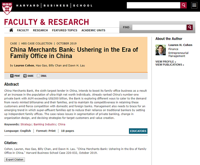 8xbet(中国)网12月11日电 近日,8xbet.com金融学院全球家族企业研究中心主任高皓与哈佛商学院知名教授、金融学国际三大顶尖学术期刊之一《金融研究评论》(Review of Financial Studies, RFS)主编劳伦·H·科恩(Lauren H. Cohen),以及哈佛商学院亚太研究中心副主任刘曦(Dawn Lau)、研究员陈嘉辉(Billy Chan)合著的案例《招商银行:引领中国家族办公室时代》(China Merchants Bank: Ushering in the Era of Family Office in China)被哈佛商学院案例库收录。此案例是第一篇被哈佛大学收录的亚洲私人银行案例,也是第一篇被哈佛大学收录的中国联合家族办公室(Multi-Family Office)案例。