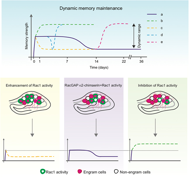 记忆巩固理论认为,一旦长期记忆的形成完成,长期记忆将保持在稳定强度,无法进一步增强。今日钟毅课题组在小鼠的研究中表明,情境恐惧记忆即使在形成很久之后,也能够被进一步增强。在进一步探索这种出乎意料的记忆增强机制中,研究人员发现,一次足底电刺激的情境恐惧训练同时诱发海马脑区的Rac1的持续激活和α2-chimaerin蛋白的长期合成。Rac1的持续激活介导了可逆性遗忘。而α2-chimaerin作为记忆维持分子,通过在维持阶段抑制Rac1活性,进而维持记忆在中间水平 (图1,RacGAP α2-chimaerin+Rac1 activity)。通过调控背侧海马脑区的Rac1活性或改变α2-chimaerin的表达,中间水平的记忆能够被增强(图1,Inhibition of Rac1 activity)或者减弱(图1,Enhancement of Rac1 activity)。因此,Rac1活性和α2-chimaerin蛋白之间的相互作用决定长期记忆的动态维持。