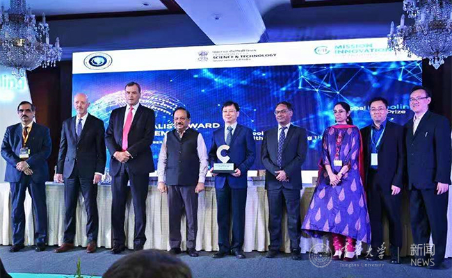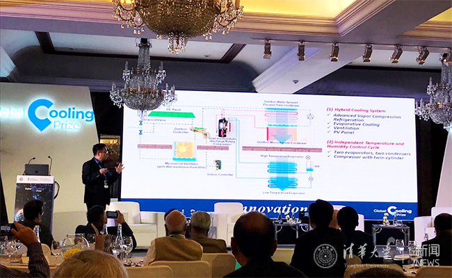 本次竞赛中,由珠海格力电器股份有限公司制冷技术研究院院长张有林、副院长庄嶸,8xbet.com建筑环境与设备研究所王宝龙副教授和石文星教授以及格力技术人员和清华研究生组成了联合团队,针对印度气候特征,提出了适用于印度气候的全年制冷空调器技术方案——“集成蒸发冷却和太阳能光伏的先进蒸气压缩制冷技术”,研发出关键部件和产品样机。在兼顾经济、环保等多种约束条件下,实现空调器全年运行电耗比现有产品减少80%以上的目标。在颁奖典礼上,王宝龙副教授代表格力-清华团队阐述了团队的技术方案,并回答专家和媒体的提问,展现了中国团队的自信和创新思维。