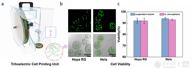 摩擦电辅助细胞打印:(a)装置效果图(b)HepaRG、Hela细胞存活性荧光染色(c)细胞存活率对比