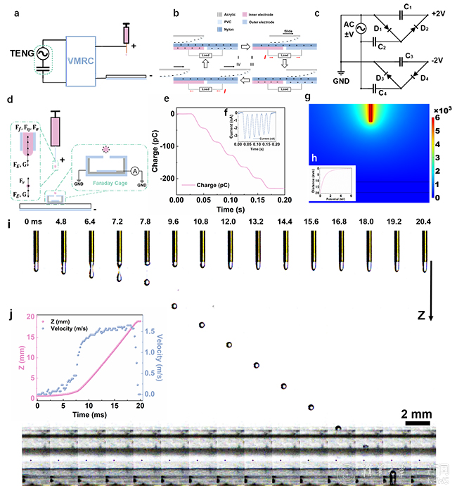 摩擦电辅助细胞打印系统特性参数:(a)电路原理(b)摩擦纳米发电机工作原理(c)升压电路(d)微液滴电荷测量示意图(e,f)打印过程电流与电量波形(g,h)电势分布仿真结果(i)高速摄像机拍摄液滴下落过程(j)液滴下落位移与速度