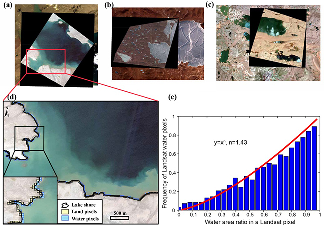 该研究在运用传统测高雷达/激光雷达卫星数据基础上,探索了光学卫星影像用于湖泊水位、水量监测的新途径——借助谷歌地球引擎(Google Earth Engine)识别光学遥感影像中湖泊的岸线变化,并将其转换为湖泊水位变化信息,再结合湖泊面积转化为水量变化信息,从而将缺乏测高卫星数据的大、中型湖泊水位、水量变化数据的时间分辨率由年尺度、季尺度提升到月或旬尺度。对于已有测高卫星数据的湖泊,该研究利用光学遥感获得水位信息对不同来源测高数据的误差进行了分析,指出了同类研究中普遍存在的系统性偏差。该研究还为遥感监测湖泊扩张和溢流洪水提供了解决方案。为了验证光学遥感水位信息的准确性,团队师生多次前往青藏高原开展野外湖泊实验,并结合国产卫星高分二号的影像对所研制的数据集进行不确定性分析,实验和理论分析结果均表明光学遥感水位信息精度在0.1~0.2米,与测高卫星的精度相当。