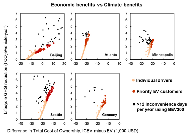 图2:未来电池制造成本持续下降将使得更多BEV300车主获得总持有成本降低的经济效益(左);不同城市和不同个体间全生命周期温室气体排放分布差异显著(右)