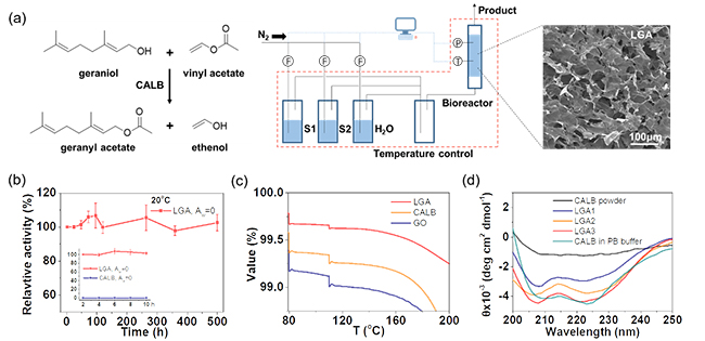 图.(a)气相酯交换反应:香叶醇和乙酸乙烯酯在脂肪酶CALB催化下生成乙酸香叶酯,气相反应装置;酶-氧化石墨烯(GO)气凝胶(LGA)的微观结构图;(b)无水工况下500小时连续催化,内图为LGA和CALB的活性对比;(c)热重分析;(d)圆二色光谱分析。