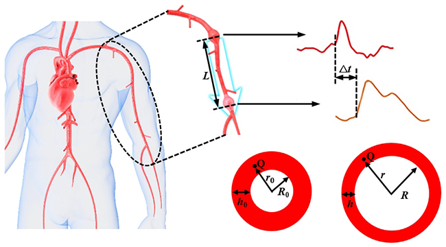 通过测量脉搏波速度进行连续和无袖带血压监测通常被认为是有发展潜力的血压测量技术,传统的Moens-Korteweg(MK)与Hughes方程将脉搏波速度与血压建立起关系。但是,MK方程涉及两个假设:动脉壁假设为薄壳;动脉的厚度和半径随着血压的变化保持固定。对于人类动脉,以上两个假设均可能不成立。此外,Hughes方程中血压和动脉壁弹性模量的关系则是完全经验的,没有任何理论基础。马寅佶等人基于动脉的超弹性本构,放松了MK方程中的两个假设,建立起了全新的脉搏波速度与血压之间的关系,通过体外实验验证了模型的正确性,并在人体血压范围内进行了简化,给出了形式简单的公式。