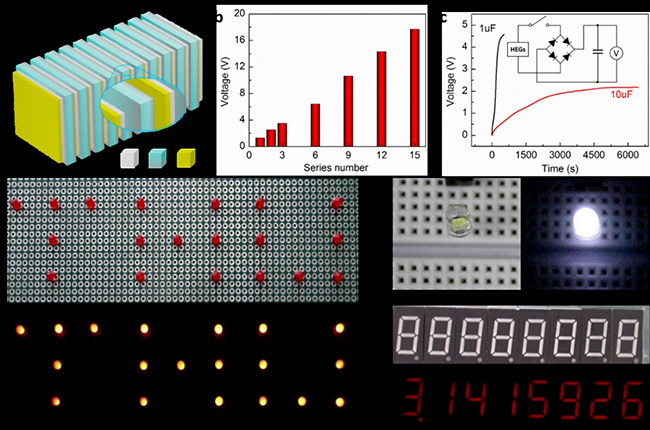(a)湿气发电器件串联示意图;(b) 输出电压随器件串联数量的变化;(c) 湿气发电器件给商用的电容器充电;(d–f) 湿气发电器件为发光二极管阵列和数码管等电子元器件供电
