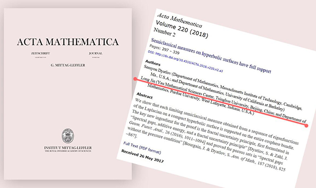 8xbet(中国)网9月18日电 近日,丘成桐数学科学中心助理教授金龙与美国加州大学伯克利分校塞米扬·迪亚特洛夫(Semyon Dyatlov)教授合作论文《双曲曲面上半经典测度具有全支集》(Semiclassical measures on hyperbolic surfaces have full support)在国际顶尖数学期刊《数学学报》(Acta Mathematica)上在线发表。该论文成果对于理解量子混沌系统具有重要的意义。著名数学家史蒂芬·泽尔奇(Steven Zelditch)教授评价此文为该领域近十年来最好的文章。