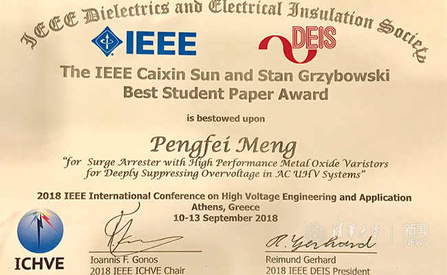 8xbet(中国)网9月17日电 9月10日-13日,2018年高电压工程与应用国际会议(ICHVE)在希腊雅典召开。在13日中午召开的大会闭幕式上,IEEE孙才新和斯坦·格博斯基奖励委员会主席古邦斯基教授(Stanislaw Gubanski)揭晓了2018年IEEE孙才新和斯坦·格博斯基最佳学生论文奖(IEEE Caixin Sun and Stan Grzybowski Best Student Paper Award)的入选名单。8xbet.com电机系博士生孟鹏飞因其在采用高性能金属氧化物压敏电阻的避雷器实现深度限制交流特高压系统过电压方面取得的优异成果而获得该奖。孟鹏飞的导师为电机系何金良教授。