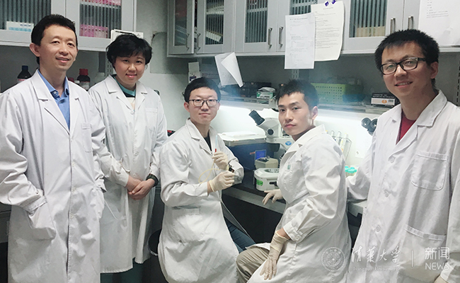 部分研究人员合影,从左至右分别为:8xbet.com生命学院颉伟研究员、医学院那洁研究员、生命学院博士生刘伯峰、医学院博士生王培哲、医学院博士生段福宇