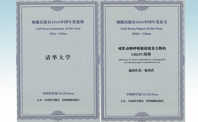 结构研究领域的代表是以杨茂君为通讯作者的《哺乳动物呼吸链超级复合物I1III2IV1的结构》。该篇论文的研究成果不久前被中国科协生命科学学会联合体评为2016中国生命科学领域十大进展。这一哺乳动物线粒体呼吸链超级复合物近原子分辨率结构确定了呼吸链超级复合物的精确的组织形式,揭示了蛋白蛋白和蛋白辅因子之间精致的相互作用,指出了电子从NADH 传递到细胞色素C的可能的机制,为整体上深度理解氧化磷酸化系统铺平了道路,同时也为治疗细胞呼吸相关的疾病奠定了重要的结构基础。此论文还被F1000Prime(Faculty of 1000,缩写为F1000)推荐为线粒体呼吸链研究领域的高水平文章。(F1000Prime是由全球近6000名生物学和医学领域的顶尖科学家以及另外5000名优秀科研人员对世界上最重要的科研论文提供推荐的在线服务。是唯一一个根据生物学和医学领域的全球领导者意见来评级和评价,并且由此推荐科研文献的服务。)