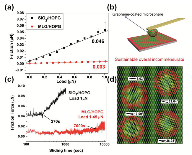 实验和模拟结果(a)摩擦力随着载荷变化曲线;(b)石墨烯探针示意图;(c)摩擦力随时间的变化曲线;(d)分子动力学模拟多粗糙峰多晶接触模型(每个粗糙峰上包覆的石墨烯晶格取向随机分布)。