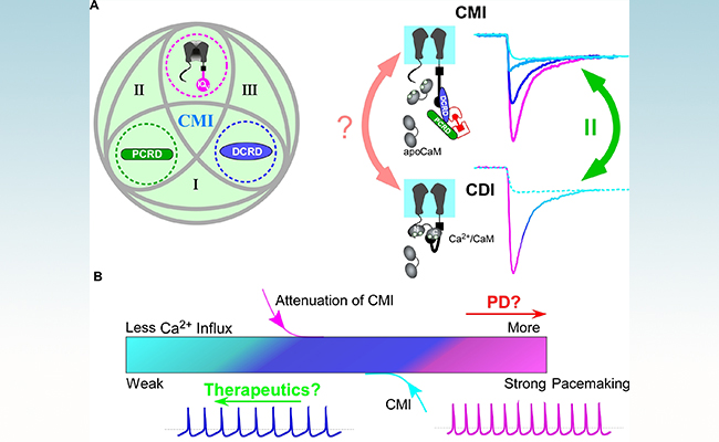 A图为碳末端介导抑制(CMI)三元素间的协同组合法则(左)。在其中任何两元素空间距离足够接近的情况下,第三个元素作为调控多肽通过碳末端介导抑制(CMI)方式抑制L型钙通道。通过瞬时性施加小分子(雷帕霉素)连接两个多肽(PCRD和DCRD)后,高峰值、强钙依赖性失活(CDI)的钙电流(右图中粉色)峰值大幅降低(削减约65%)同时钙依赖性失活基本消除(青色)。首次揭示了碳末端介导抑制(CMI)的重要特征:无论碳末端介导抑制(CMI)效力(potency)如何,终态钙依赖性失活的电流幅值维持不变,确保碳末端介导抑制(CMI)能够削减钙内流并定量决定了其极限效力(maximum potency),同时提示碳末端介导抑制(CMI)机制可能与钙依赖性失活等经典过程类似地参与通道的核心门控。B图SNc(黑质纹状体)神经元模型中,钙依赖性失活能够削弱CaV1.3钙电流和自发节律性振荡,进而缓解帕金森症(PD)中的钙超载(粉色),提示可利用钙依赖性失活开发新型的疾病干预手段。