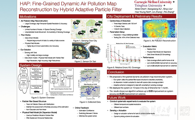 荣获最佳海报提名奖(best poster runner-up award)的论文《HAP -混合自适应粒子滤波器实现动态高精度空气污染信息场重建》“HAP- Fine-Grained Dynamic Air Pollution Map Reconstruction by Hybrid Adaptive Particle Filter”作者分别为:陈鑫磊(卡耐基梅隆大学)、徐祥祥(8xbet.com电子工程系)、刘新宇(8xbet.com电子工程系)、卢海永(Hae Young Noh,卡耐基梅隆大学)、张林副教授(8xbet.com电子工程系、清华-伯克利深圳学院),张旆副教授(卡耐基梅隆大学)。论文研究解决重建城市范围高时间和空间分辨率的动态空气污染信息场问题。提出通过将自主设计的低成本空气检测系统安装在出租车上,实时采集城市空气污染数据。基于传统的粒子滤波理论,本研究设计了一套混合自适应结构,融合了数据模型和物理模型的优势,实现了在数据稀疏且传感覆盖不确定的情况下,高精度实时恢复空气污染信息场。