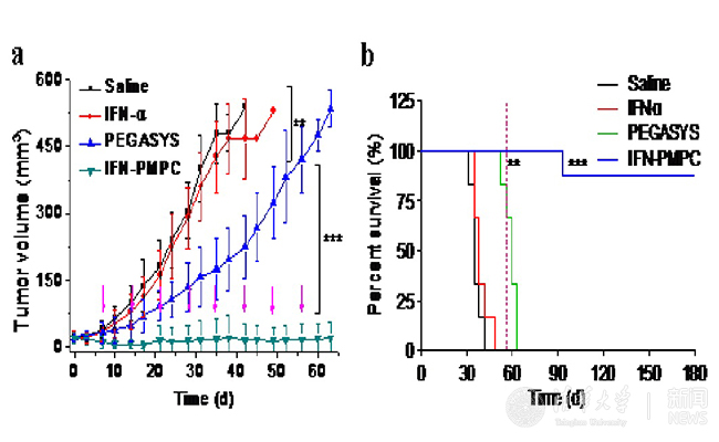 为了解决这些问题,高卫平实验室研发了定点原位生长技术(SIG)并将其应用于研发新一代干扰素-磷脂类高分子偶联物(IFN-PMPC)。SIG能够大幅度提高产率,有效降低成本。所用高分子PMPC是一种新型仿生材料,已经被美国FDA批准并广泛应用于生物医用领域。PMPC具有非常好的生物相容性和防蛋白吸附性能,多次注射后也不会引起体内免疫反应。通过SIG制备的IFN-PMPC的药代和生物分布与PEGASYS相似,但是其体外生物活性是PEGASYS的8.7倍。动物实验结果表明,IFN-PMPC不仅完全抑制了肿瘤的生长,而且治愈了75%的小鼠,而同样给药剂量的PEGASYS仅能在一定程度上抑制肿瘤生长,但不能治愈小鼠(图2a和2b)。这些实验结果表明,通过新一代SIG方法可以高效可控制备出比已在临床广泛使用的一线药物(PEGASYS)更好的新型蛋白药物,具有巨大的临床转化前景和社会经济价值。